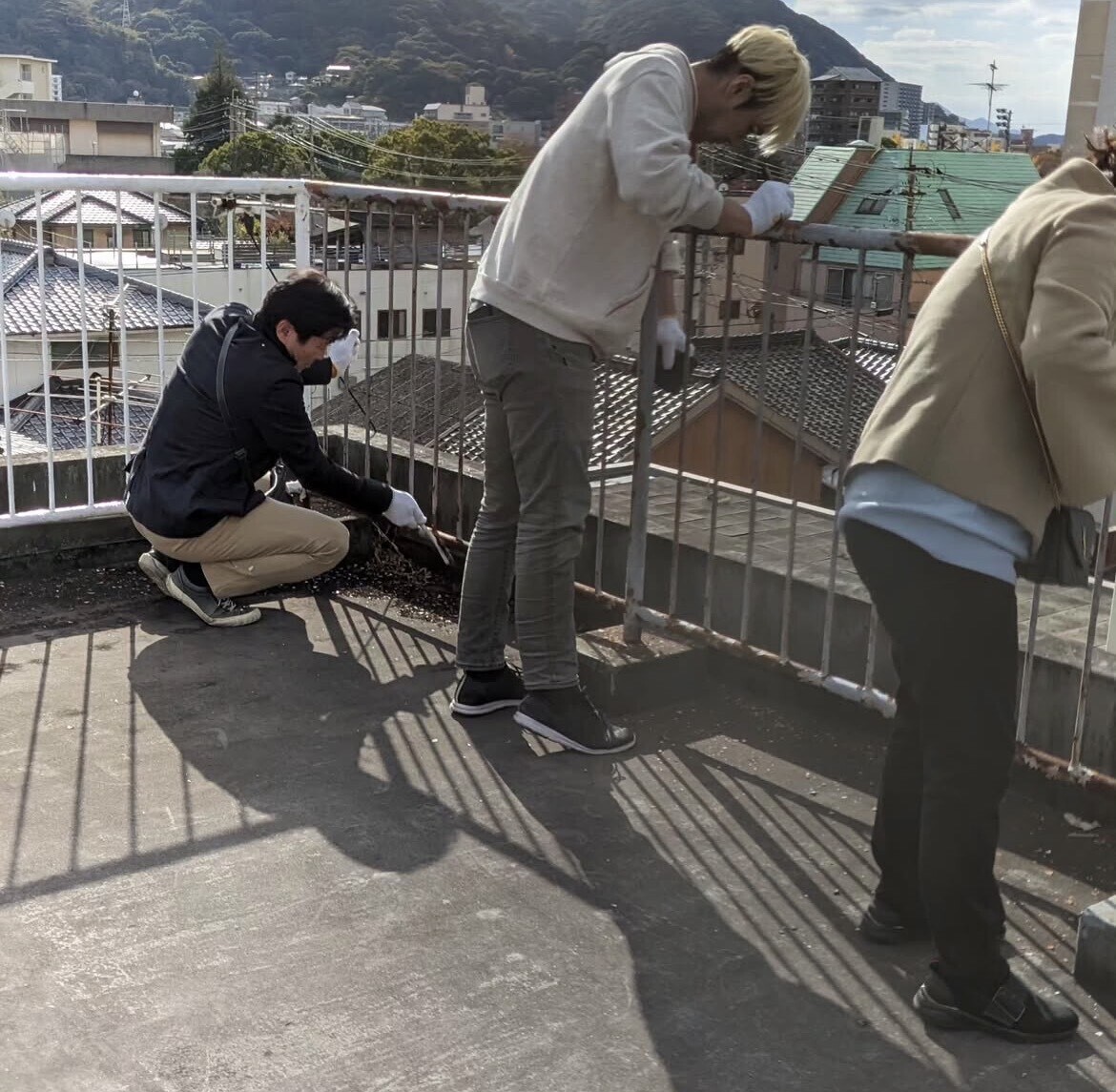 マネージャー牛島の手作りの豚汁を食べたあとは、屋上の手すりをきれいに研いて塗装する作業を行ないました。
